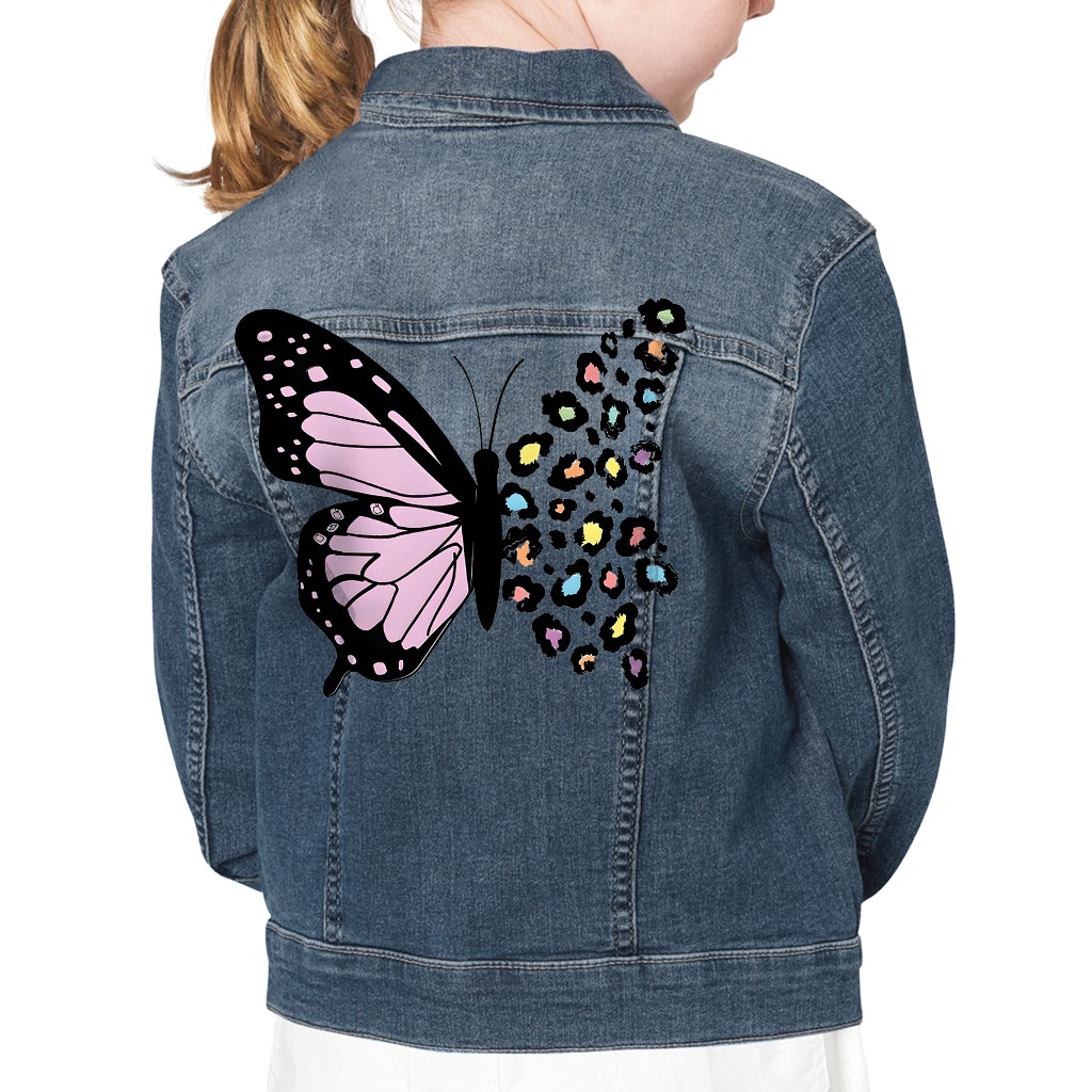 Trendy jean jacket for kids is designed with regular fitted style and is comfortable to wear. Colorful Leopard Butterfly Kids’ Denim Jacket is perfect for daily wear, party, holiday, travel, school, outdoor activities, sports, and birthdays, it is also a great gift for kids.