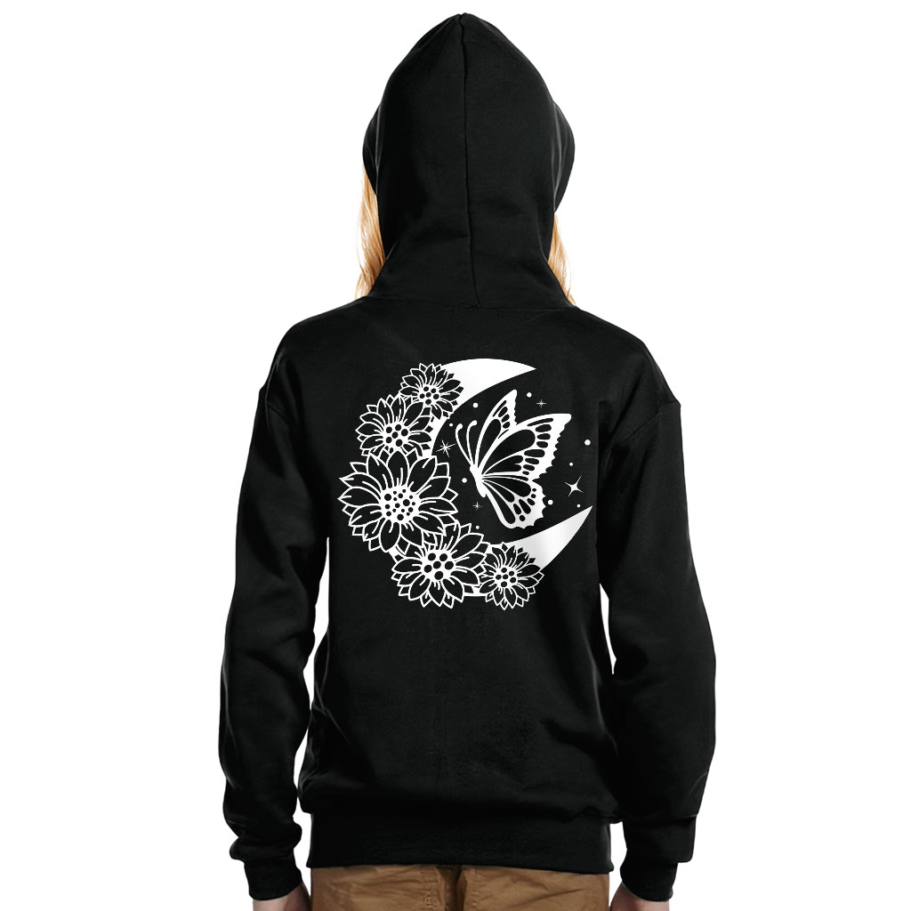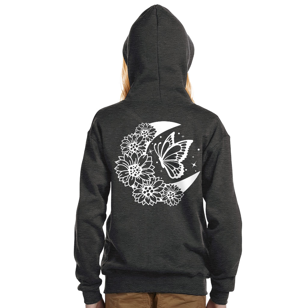 Floral Moon Butterfly Kids’ Full-Zip Hoodie combines soft fabric with simple street style for an everyday look your kid will want to wear every day. With a full zipper, it’s the perfect extra layer on a chilly day.