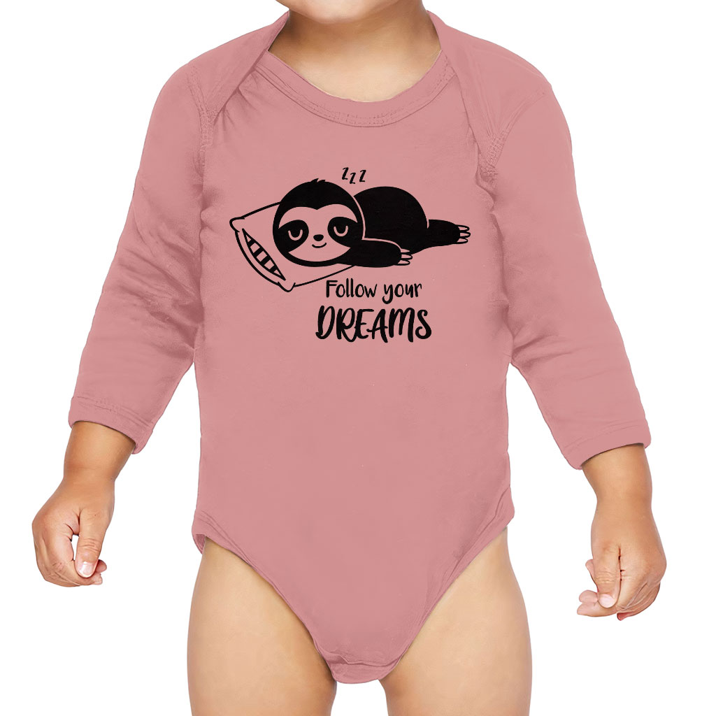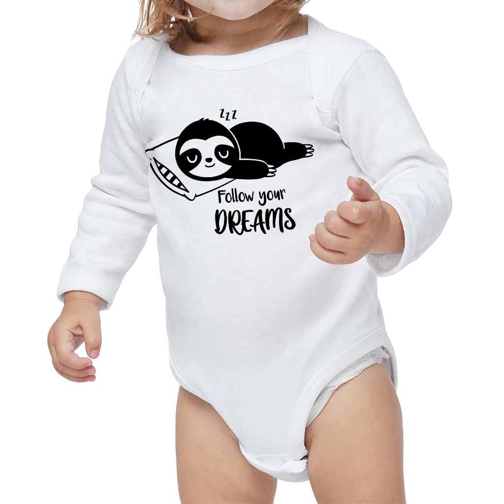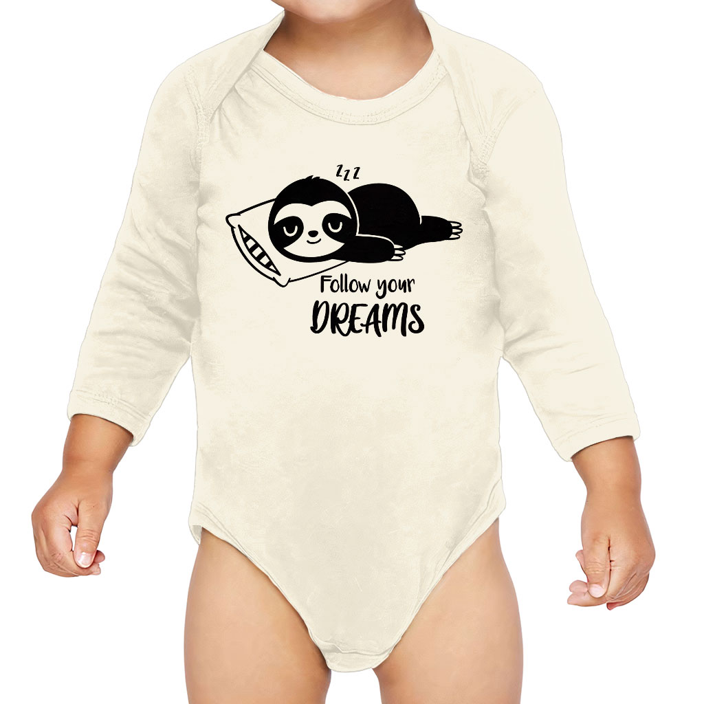 Follow You Dreams Baby Long Sleeve Onesie is made of high-quality fabric which makes it soft on the skin, breathable, lightweight, and comfortable to wear. Made of high-end materials, with sturdy stitching and non-fade colors, these bodysuits are extra-durable.