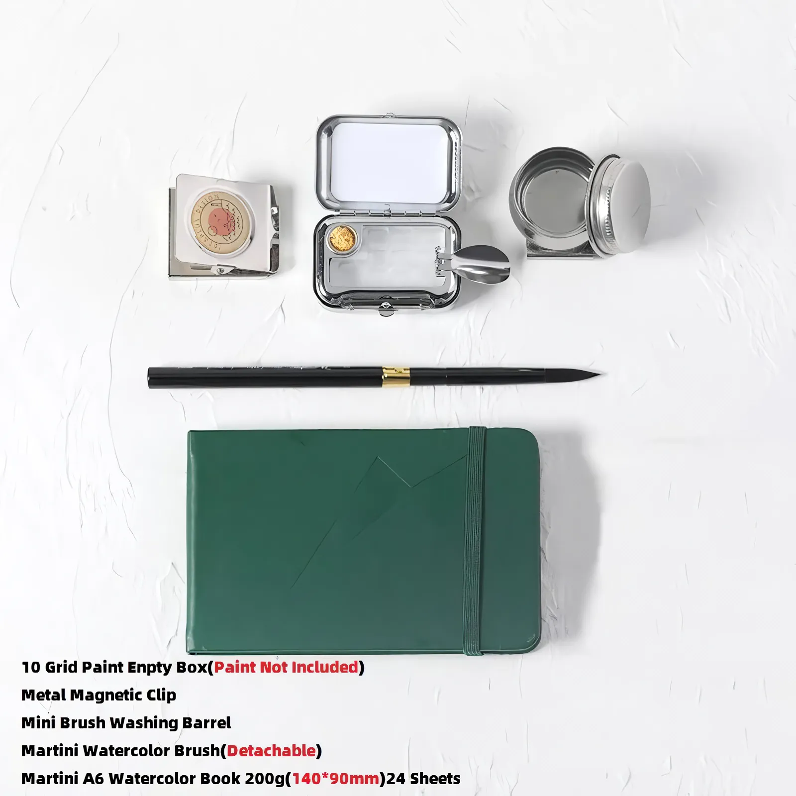 Designed for the artist on the go, this Portable Mini Watercolor Palette Box offers the ideal solution for painting whenever inspiration strikes. With compact, durable construction and available in 10 or 16 compartments, it allows you to organize and carry a wide range of colors easily. This mini palette box comes equipped with a magnetic clip for secure attachment, a small water bottle, and a Martini watercolor brush, making it perfect for travel, urban sketching, or quick plein-air painting sessions.