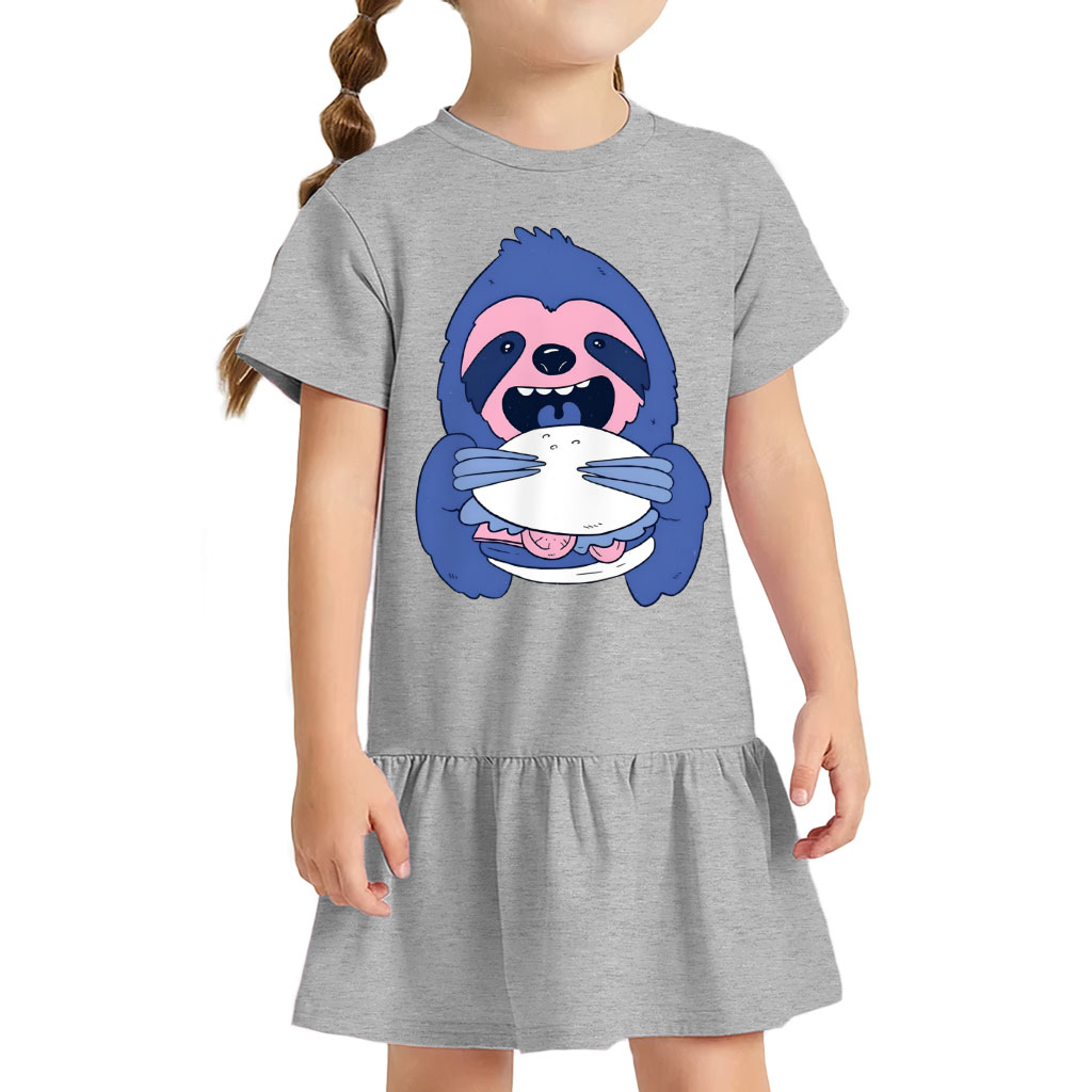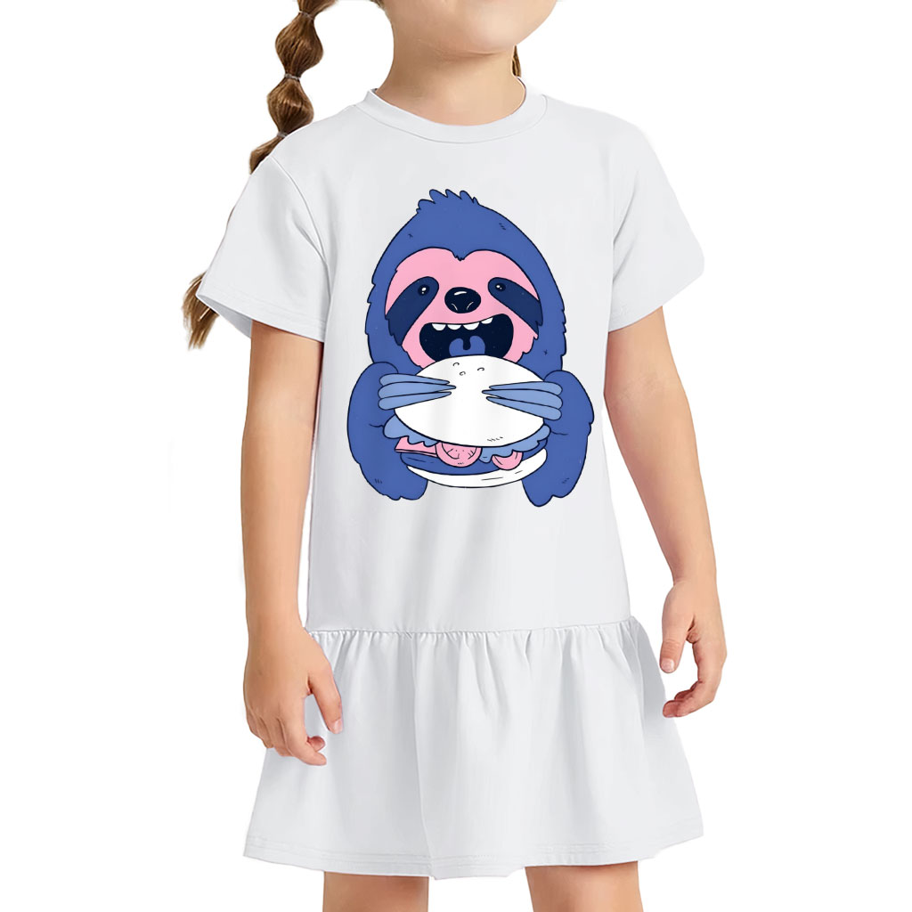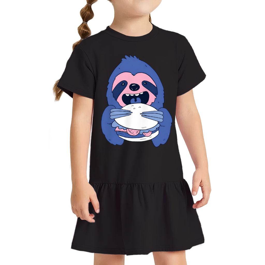 The design is printed on a soft, comfortable, 100% combed ringspun cotton short-sleeve dress. Sloth Eating Burger Toddler Rib Dress will become a staple in your child’s wardrobe.