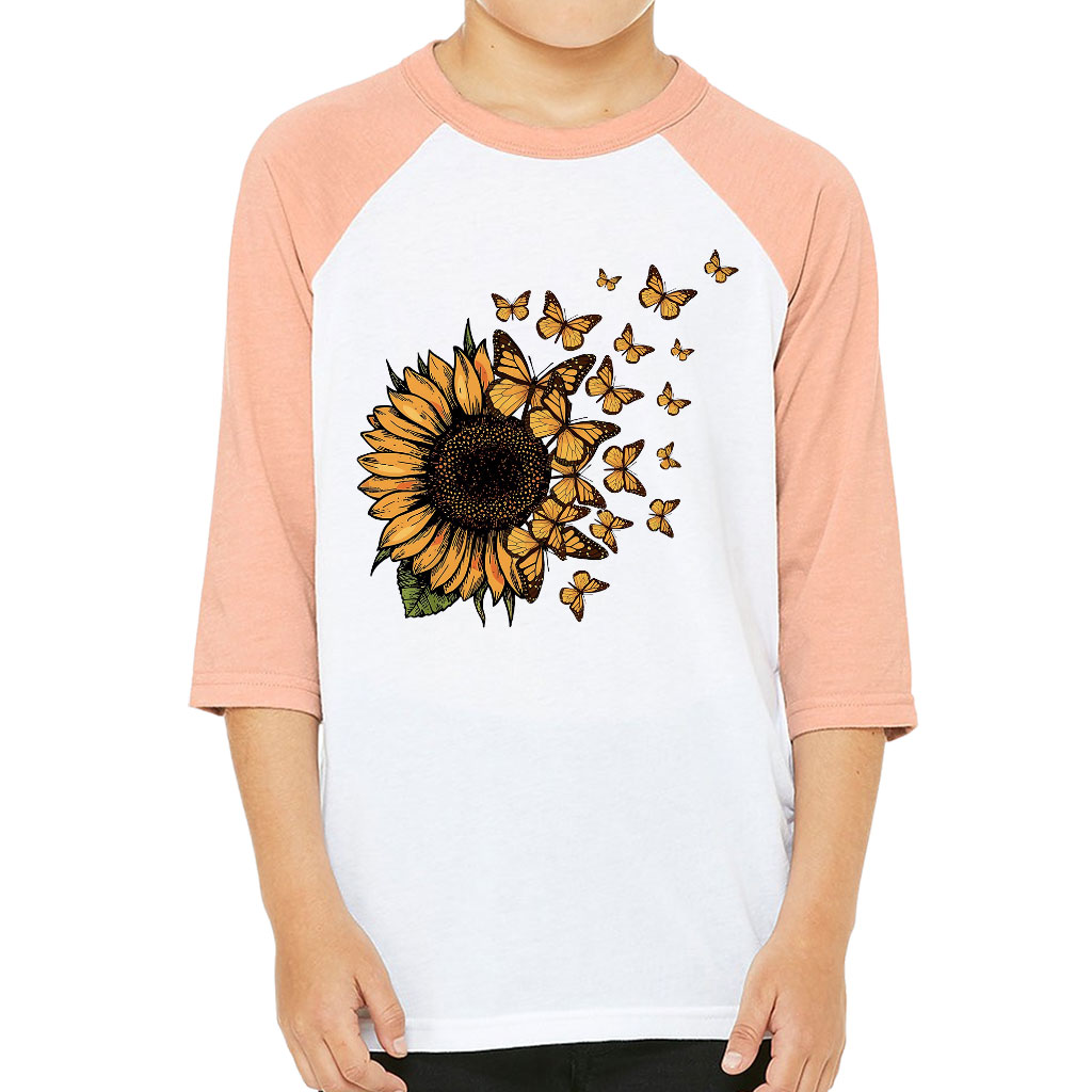 Sunflower Butterflies Kids’ Baseball T-Shirt is made from a comfortable cotton blend that keeps them looking and feeling cool all day long. A favorite piece that looks great on everyone and with everything; this baseball tee is essential for any child’s wardrobe.