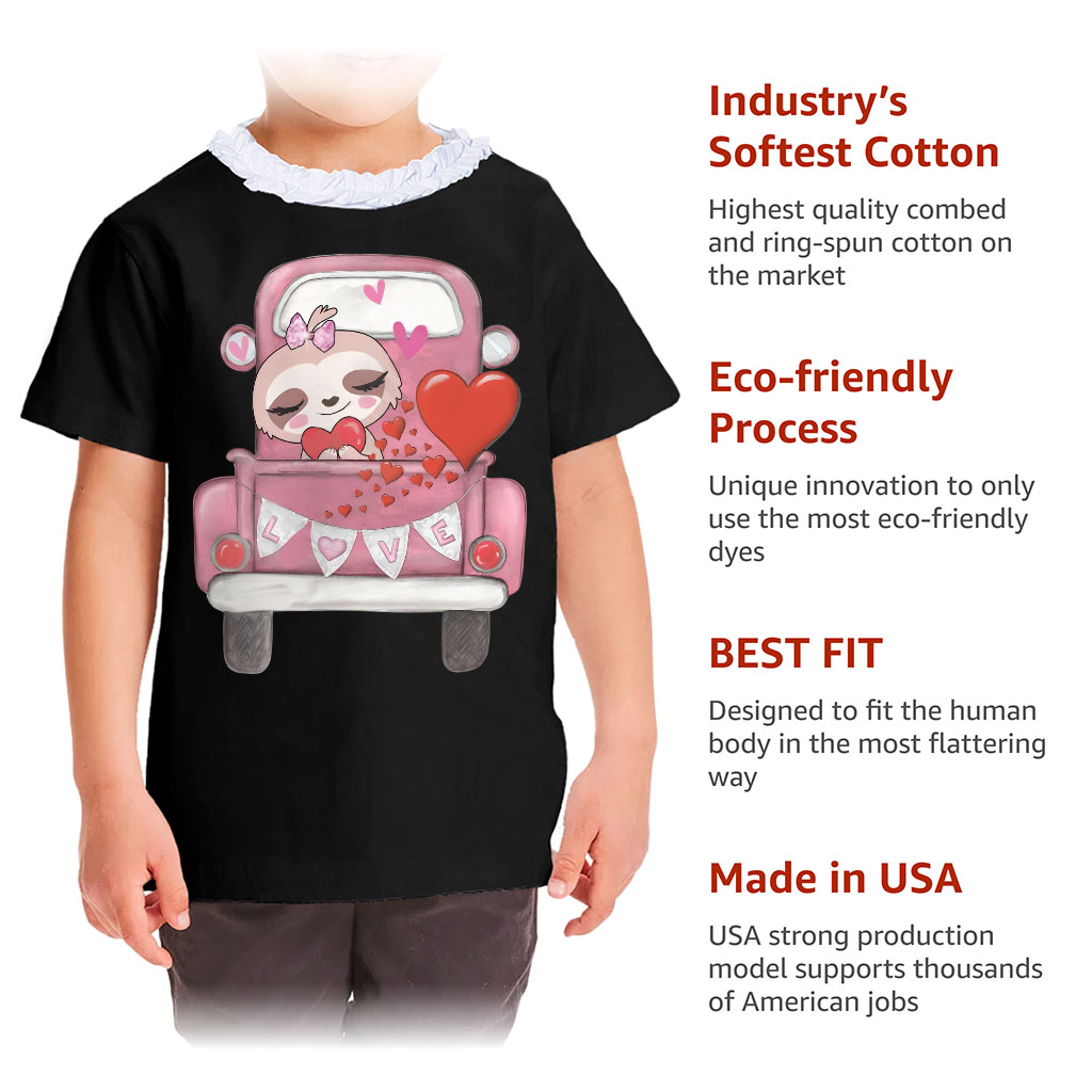 Valentines Day Sloth Girls’ Ruffle Neck T-Shirt features breathability and lightweight fabric, which is not easy to wrinkle and deform, and the fabric is soft and skin-friendly, which can better protect the delicate skin of children, bringing a more comfortable experience.